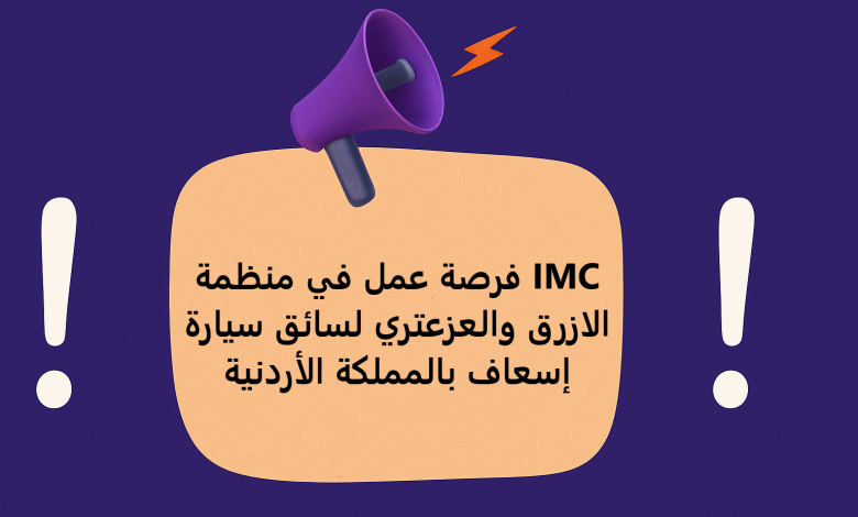تم الإعلان عن فرصة عمل شاغرة وهي وظيفة سائق سيارة إسعاف شاغرة في منظمة IMC بمخيم الأزرق والزعتري: